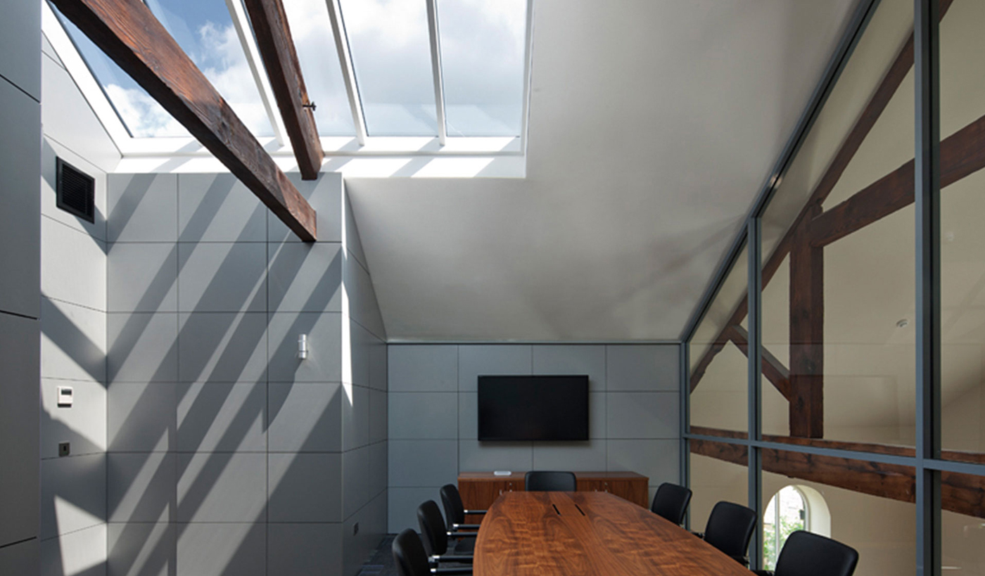 A lofty triple-height void has been created above the reception. Within this space the new second floor takes the form of a faceted timber-clad box, above which a glazed screen encloses the top-level board room.