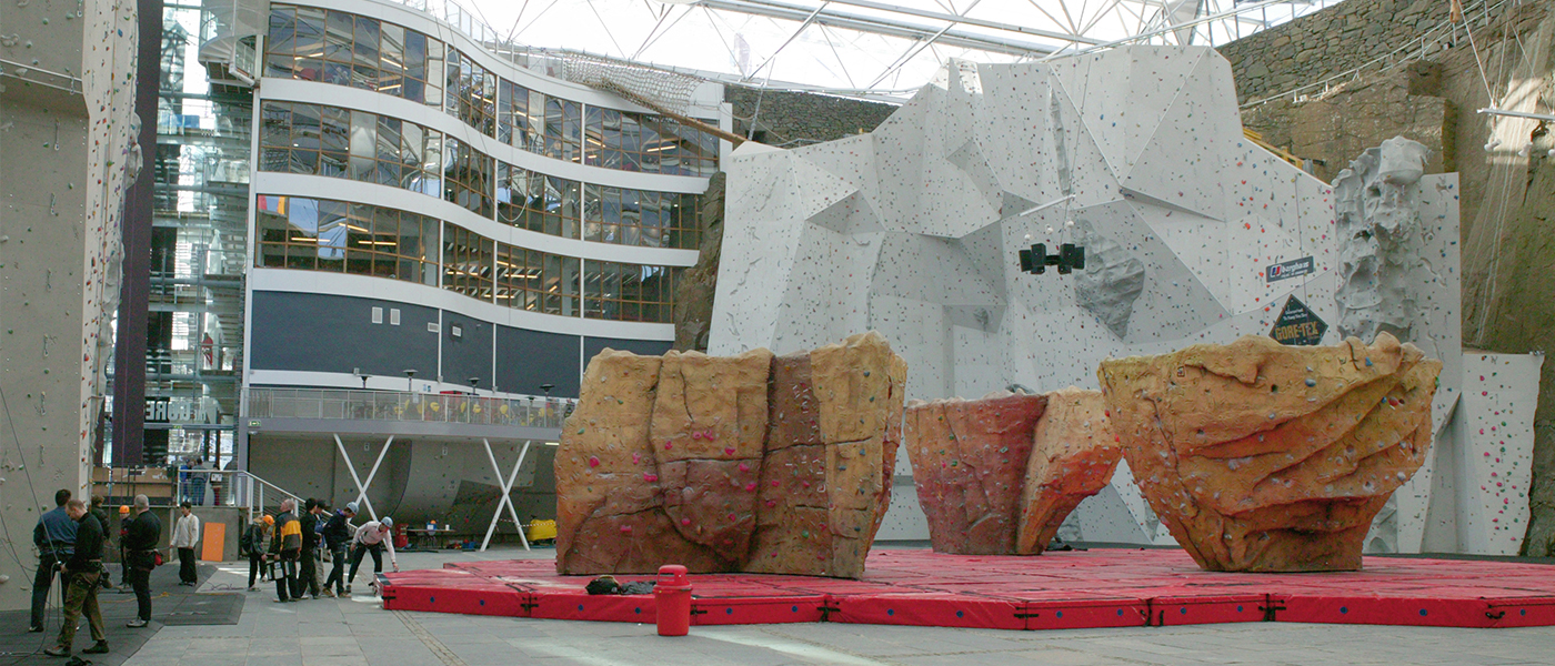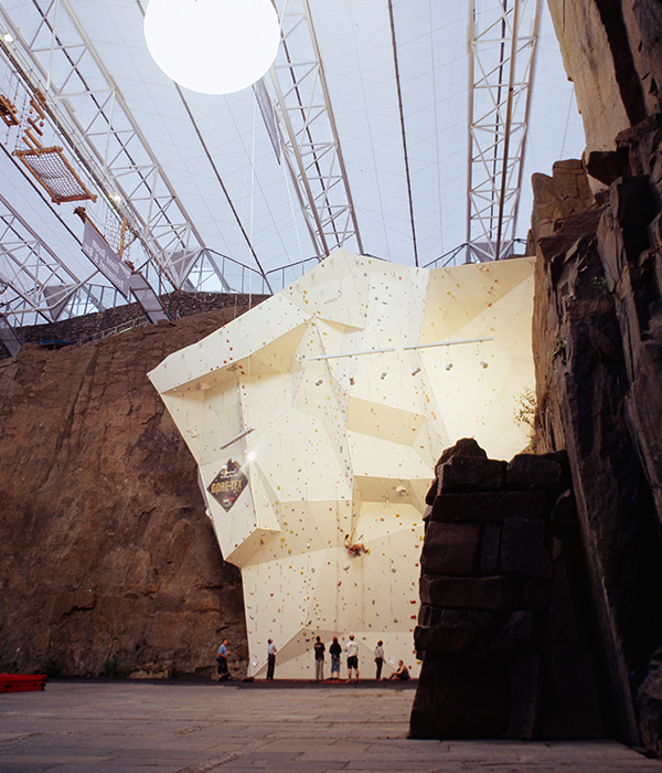 To create the space for the new arena was a huge geo-technical exercise: the infilled quarry bowl was cleared of 250,000 tonnes of spoil and rubble to form the climbing hall with a 5 storey accommodation building containing ancillary facilities was built adjacent to this.