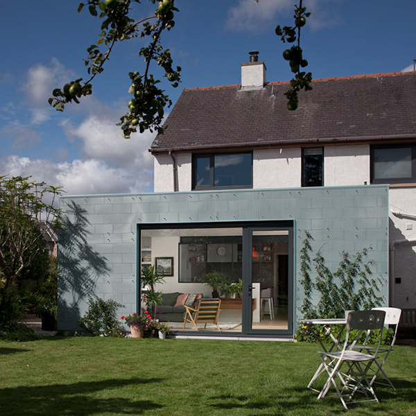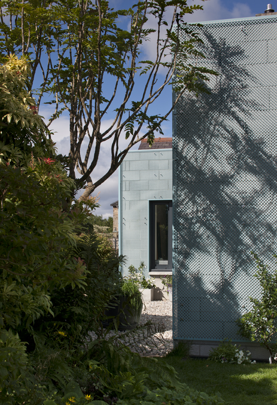 The new garden-facing walls were conceived of as a trellis, to allow plants to colonise and soften the facade. Just as the street elevation has an applied facade, so the new facade is similarly legible as an applied surface, attached to the rear of the building. The trellis is formed using a perforated, powdercoated aluminium mesh, held 50mm off the concrete block walls behind. Full scale mock-ups were put in place to test the layering of materials and the combined effects of light and shadow, colour and texture. Over time the connection between garden and building will become stronger as plants grow to cover the new facade.