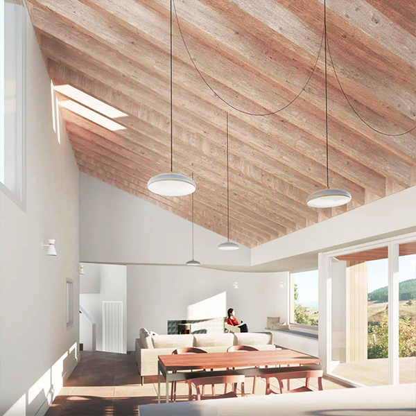 A large open-plan living space under the mono-pitch roof structure. Glazing is set back on the south façade to provide shading and a covered sitting area. On the north façade a series of windows frame views to the hillside above.