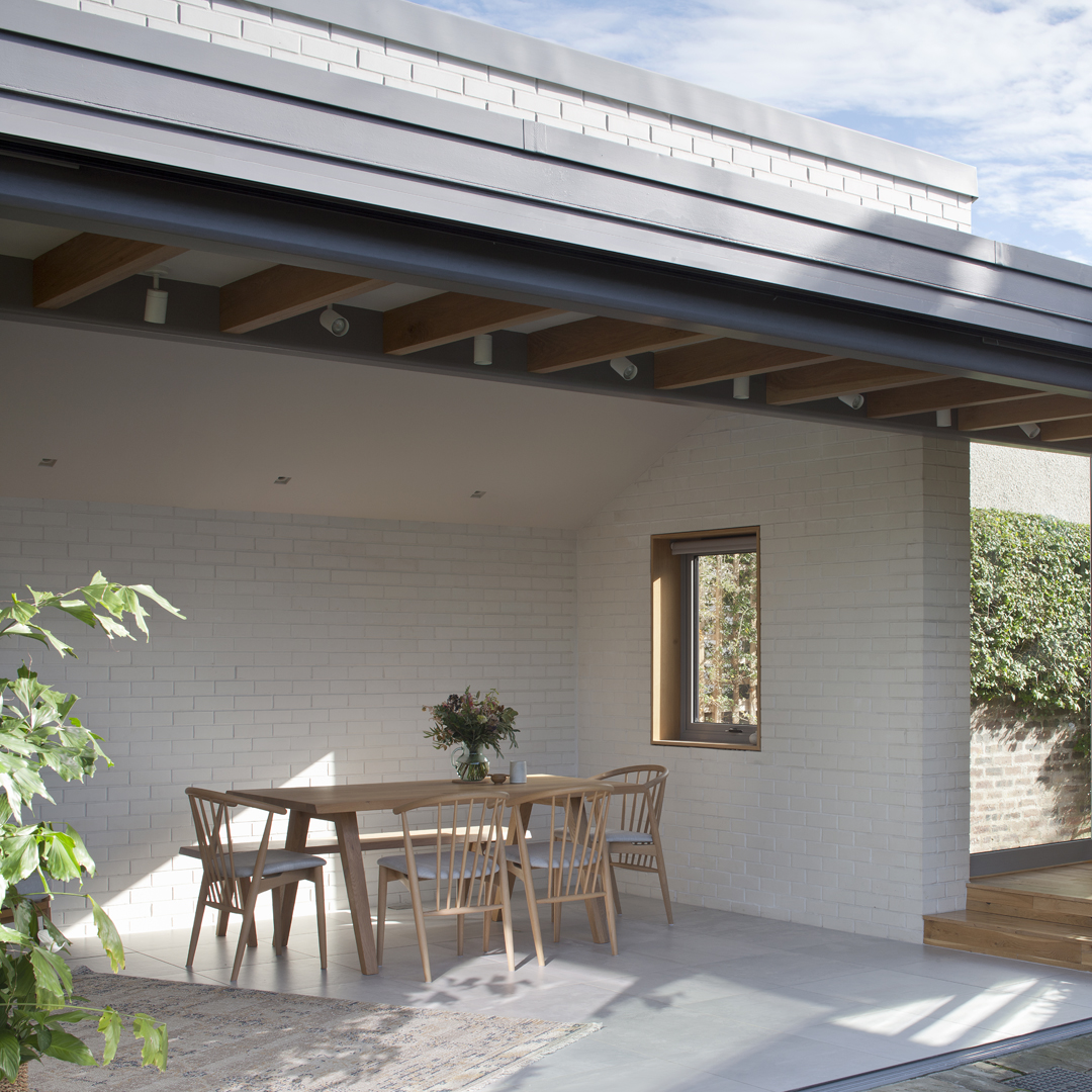 The extension replaced a small garage and is made up of two elements: a glazed ‘arcade’ and a white brick ‘cottage’. The arcade forms a passageway that links to the existing house and opens up entirely to the west facing garden. The roof structure in steel and oak spans the full length of the arcade and is held slightly apart from the brick shell of the cottage on one side and from the wall of the original house on the other. The new space provides a space for sitting and dining, with windows positioned to allow light to fill the space at all times of the day and the year. Blurring the boundary between inside and outside, bi-folding doors can be retracted to allow the entire width of the space to be opened up to the garden. Minimal detailing and a palette of oak and steel roof beams, white bricks and light grey ceramic tiles help create a calm atmosphere.