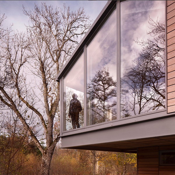 The overall aesthetic is utilitarian: the cantilevered steel ring beam is expressed as a horizontal element on the facade and above and below this beam are panels of glazing and horizontal larch boards. The cladding is edged with aluminium trims that break up the facades into bays and a pitched roof is covered in galvanised, profiled metal sheet. On the west elevation the steel structure is revealed internally and set back from the glass wall, to maximise the transparency and give views down the river valley, with the outline of Schiehallion visible through the tree canopy.