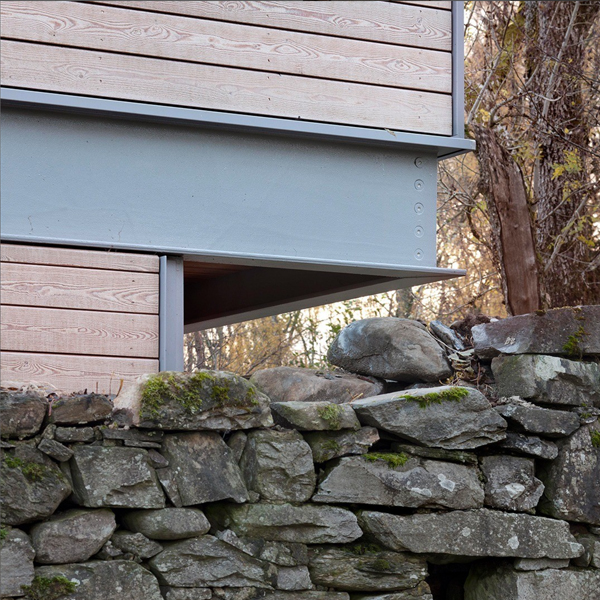 We developed a strategy whereby much of the north and east walls of the ruin were to be left in place and the more unstable and lower walls on the south and west sides were to be removed. A relatively small footprint could be located within the space defined by the original ruin, with the embankment to the river limiting the length of the building to the west. This ground floor area provided enough space for utility/ boot room, bedroom and bathroom and a stair leading to an upper level. The upper storey was then set above the height of the existing stone wall, and extends beyond it, so as to accommodate kitchen/ dining space at the east end, a second bathroom and home office/ spare bedroom and with the living space dramatically projecting out over the river bank. The cantilevering design that was developed creates a dynamic composition, as the upper volume projects over the mill and the river edge. It is also pragmatic in that it avoids the need to install a concrete structure into the unstable ground of the river embankment and provides a covered entrance and outdoor dining space