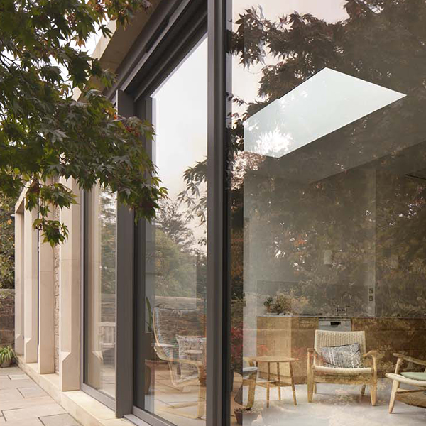 A series of slim stone piers and entablature extend across the rear facade of the utility room and extension, framing the glazed openings. These are an adaptation of the window surround features seen on the front facade and are clad in a pale, smooth-cut sandstone, to appear simple and elegant in their details and proportions.